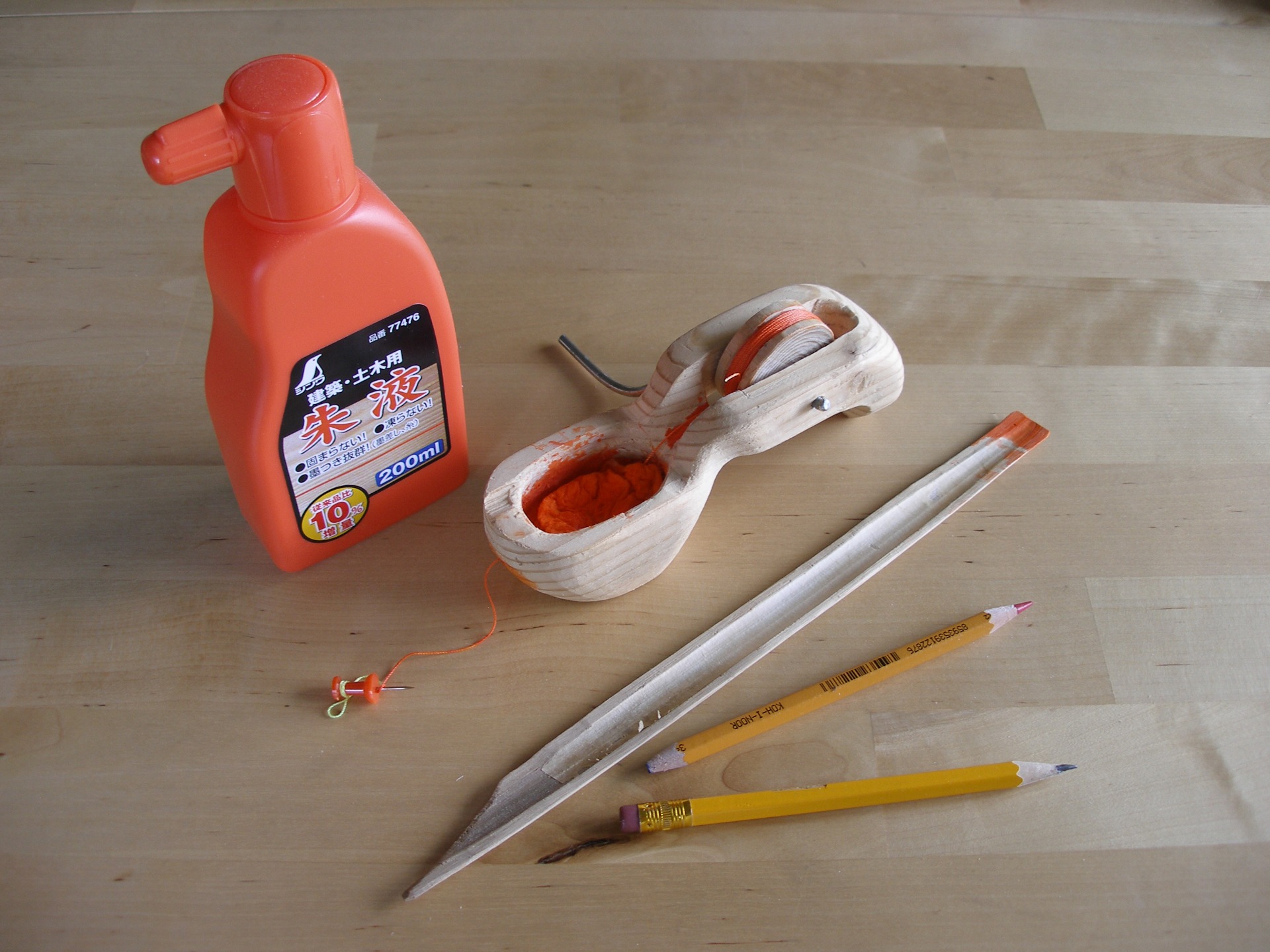 Nebo také v češtině - inkoustová brnkačka. Super věc. Zedníci znají brnkací/šlehací křídovou šňůru, která se dá koupit i poměrně běžně v obchodech. Ale na dřevo je to dost nepřesná věc. Inkoustová brnkačka je japonská tesařská záležitost, ale viděla jsem něco na ten styl i ve videích s čínskými tesaři. Slouží na dosti přesné značení dlouhých rovných čar. A buď si ji člověk koupí (specializované vesměs internetové obchody - moderní uzavřená verze např. od fy Shinwa), nebo si vyrobí klasickou dřevěnou verzi. Jako třeba já :-)