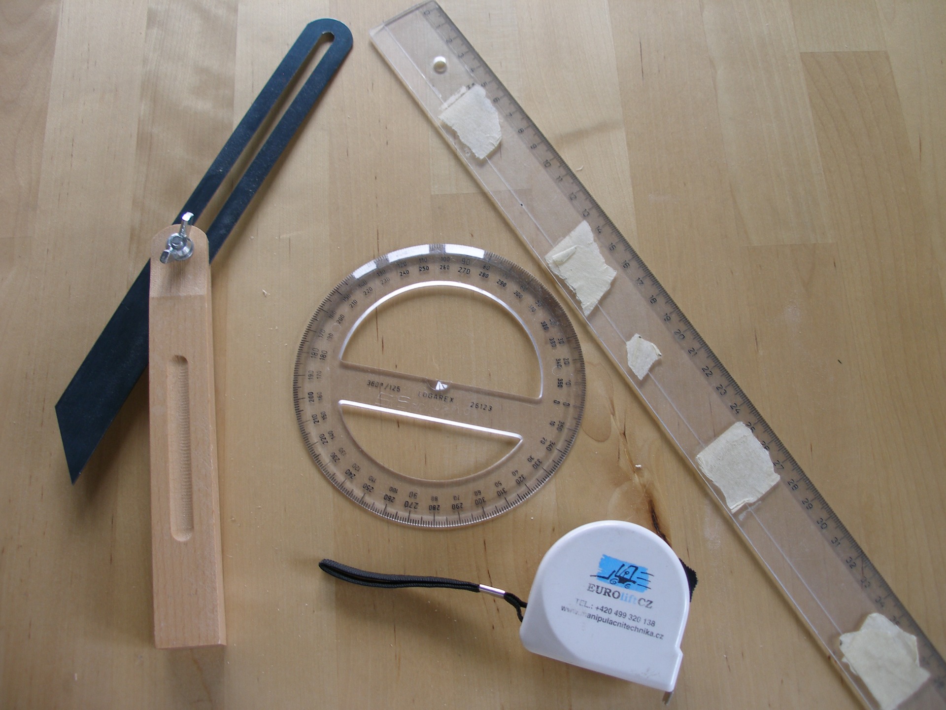 - pokosníky a úhloměry - na měření a přenášení jiných než pravých úhlů