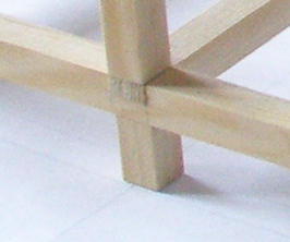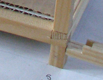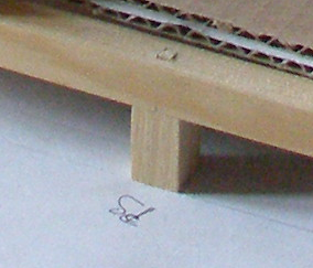 Foto patky ze západní strany. Patky, na které nenavazuje sloupek, jsou opatřeny čtverhrannými čepy (tj. čep z obou stran odsazený - 3,5 x 3,5 mm) a podlahový trámek je opatřen dlabem - u modelu průchozí dlaby (snáze se vyrábí), v reálu by nebylo nutné, aby procházely skrz podlahový trám.