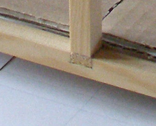 Zde naopak foto - sloupek stěny, který nenavazuje na patku. Sloupek je opatřen na spodní straně čepem, který zapadá do dlabu ve spoji podlahového trámku místnosti na podlahový trámek stěny (pas), podlahové trámky jsou spojeny opět přeplátováním na poloviční rybinu.